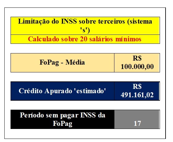Nosso trabalho contempla analisar o INSS de Terceiros devido desde JUN/2015 até os dias atuais, bem como, o INSS de Terceiros recolhido no período, a fim de providenciar os cálculos dos valores a serem pleiteados perante a Receita Federal do Brasil (RFB).